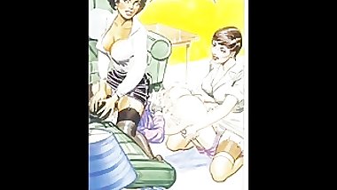 Nanny makes young dude fuck her then she fucks blonde babe with strap-on